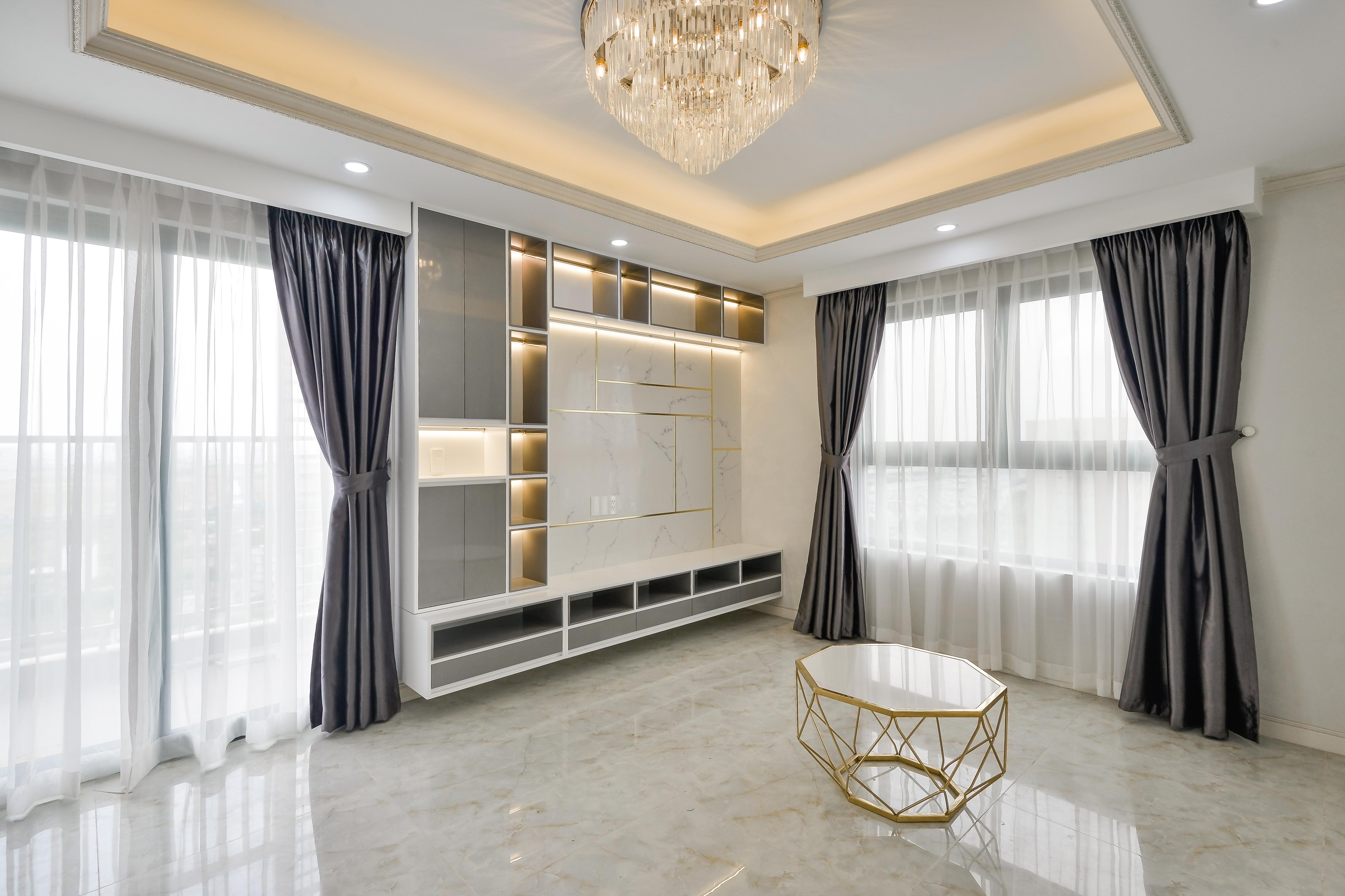 Rèm cửa: Hai lớp gồm voan trắng và vải dày màu xám tro, giúp điều tiết ánh sáng tự nhiên và tăng cảm giác ấm cúng.