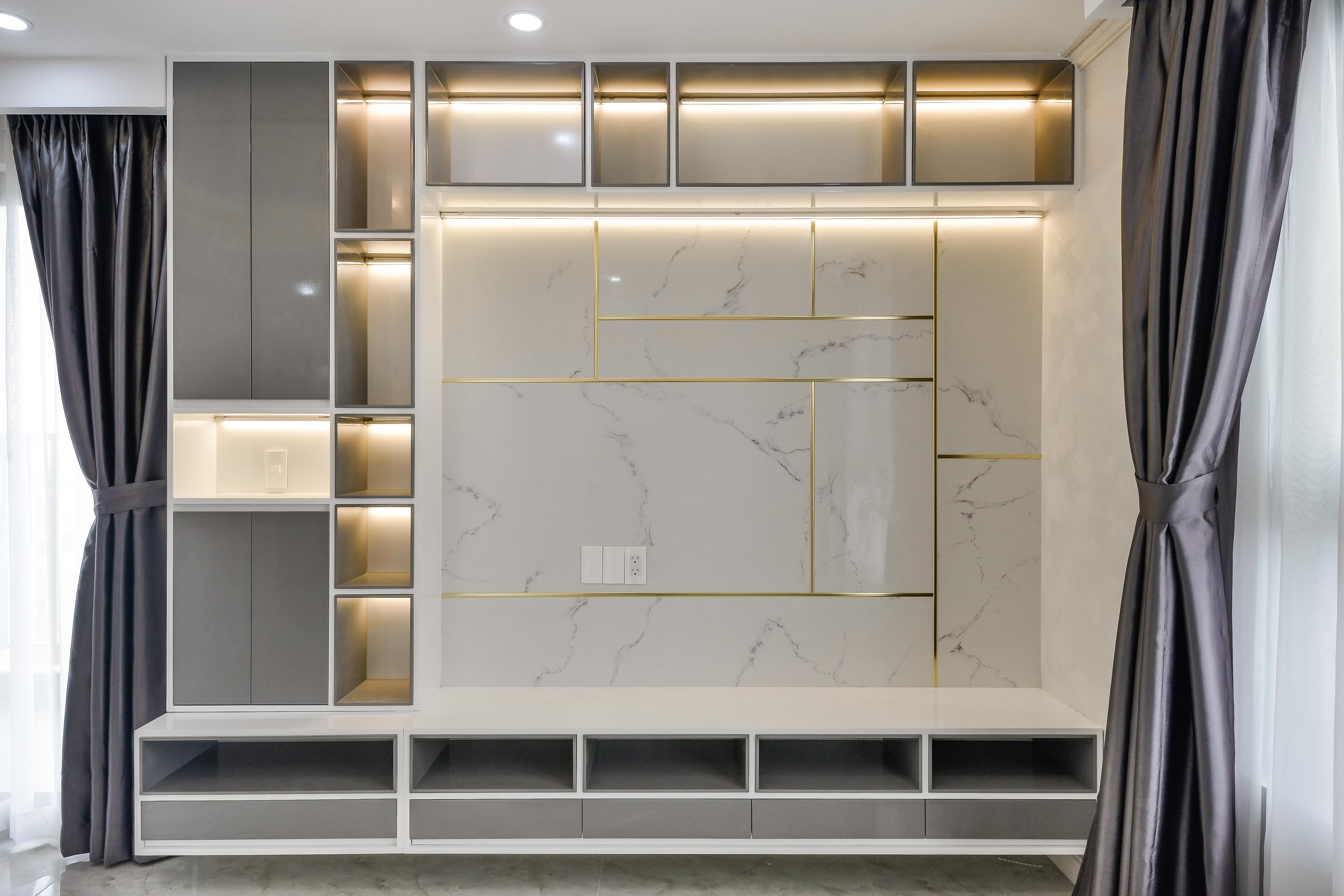 Kệ mở có đèn LED hắt âm, bố trí xen kẽ các ô trang trí màu vàng ánh kim và xám khói, vừa thẩm mỹ vừa tiện dụng.