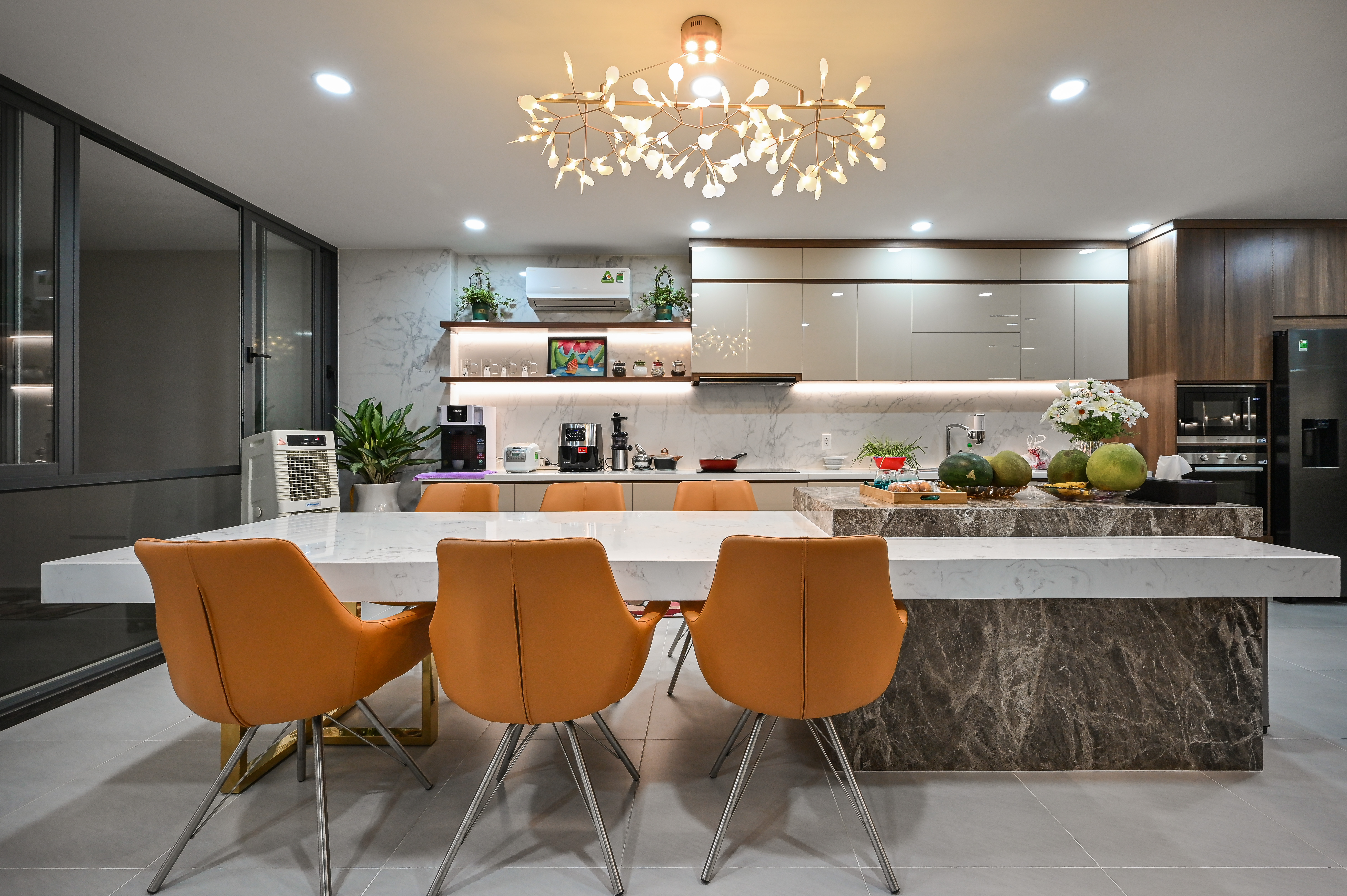 Bước vào khu vực bếp – ăn, cảm giác đầu tiên là sự ấm áp và tiện nghi lan tỏa. Bàn đảo và bàn ăn là điểm nhấn trung tâm, sử dụng mặt đá nhân tạo vân mây trắng, kết hợp chân đỡ kim loại ánh vàng sang trọng – tạo cảm giác hiện đại và tinh tế. Bộ ghế ăn da nệm màu cam đất làm điểm nhấn thị giác, mang đến sắc ấm cân bằng cho tổng thể tông màu trung tính của căn phòng.