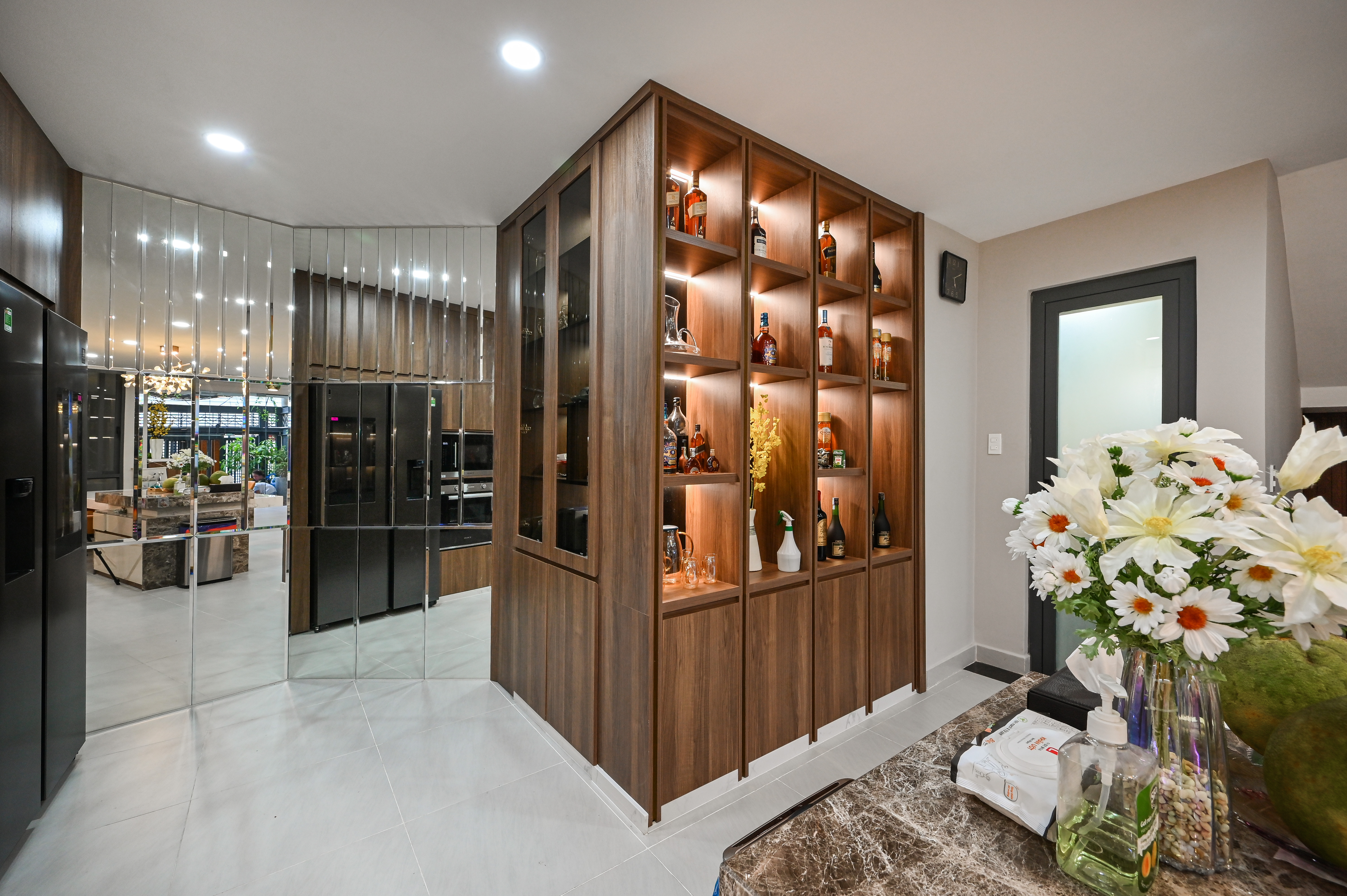 Phía đối diện, hệ gương ốp tường xẻ dọc không chỉ mở rộng không gian thị giác mà còn tăng hiệu ứng ánh sáng, giúp khu vực bếp luôn sáng sủa, rộng rãi. Từng mảng gương được thi công tỉ mỉ, phản chiếu khéo léo sự tinh tế trong cách phối vật liệu – giữa gỗ ấm, kính lạnh và ánh sáng trung tính.