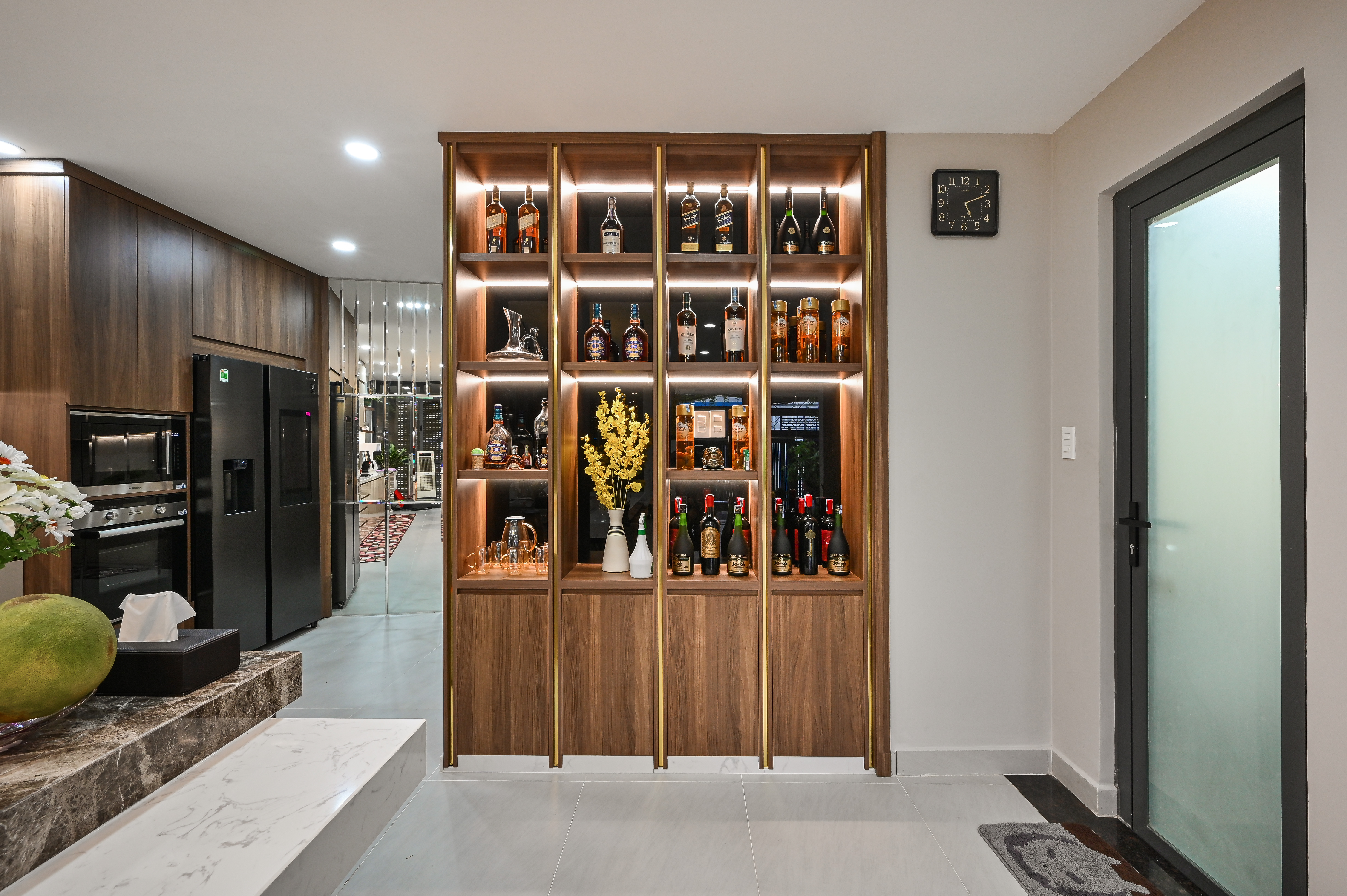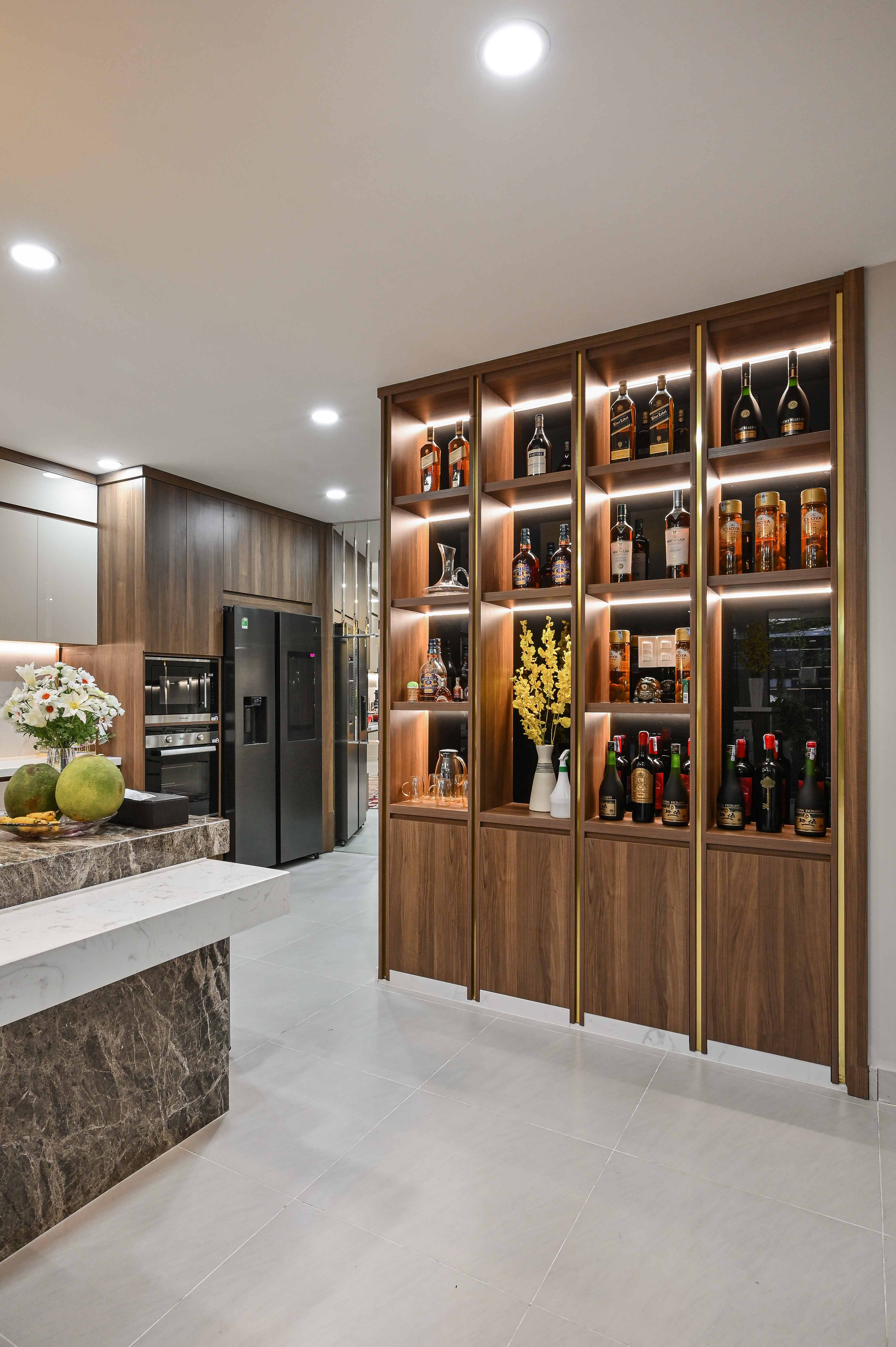 Phía cuối khu vực ăn uống, tủ rượu trang trí được thiết kế như một tác phẩm nghệ thuật, sử dụng chất liệu gỗ veneer nâu trầm phối nẹp PVD mạ vàng, cùng hệ đèn hắt âm làm nổi bật từng chai rượu và vật trang trí. Đây là góc thể hiện rõ cá tính của gia chủ – tinh tế, biết tận hưởng và trân trọng những giá trị của cuộc sống.