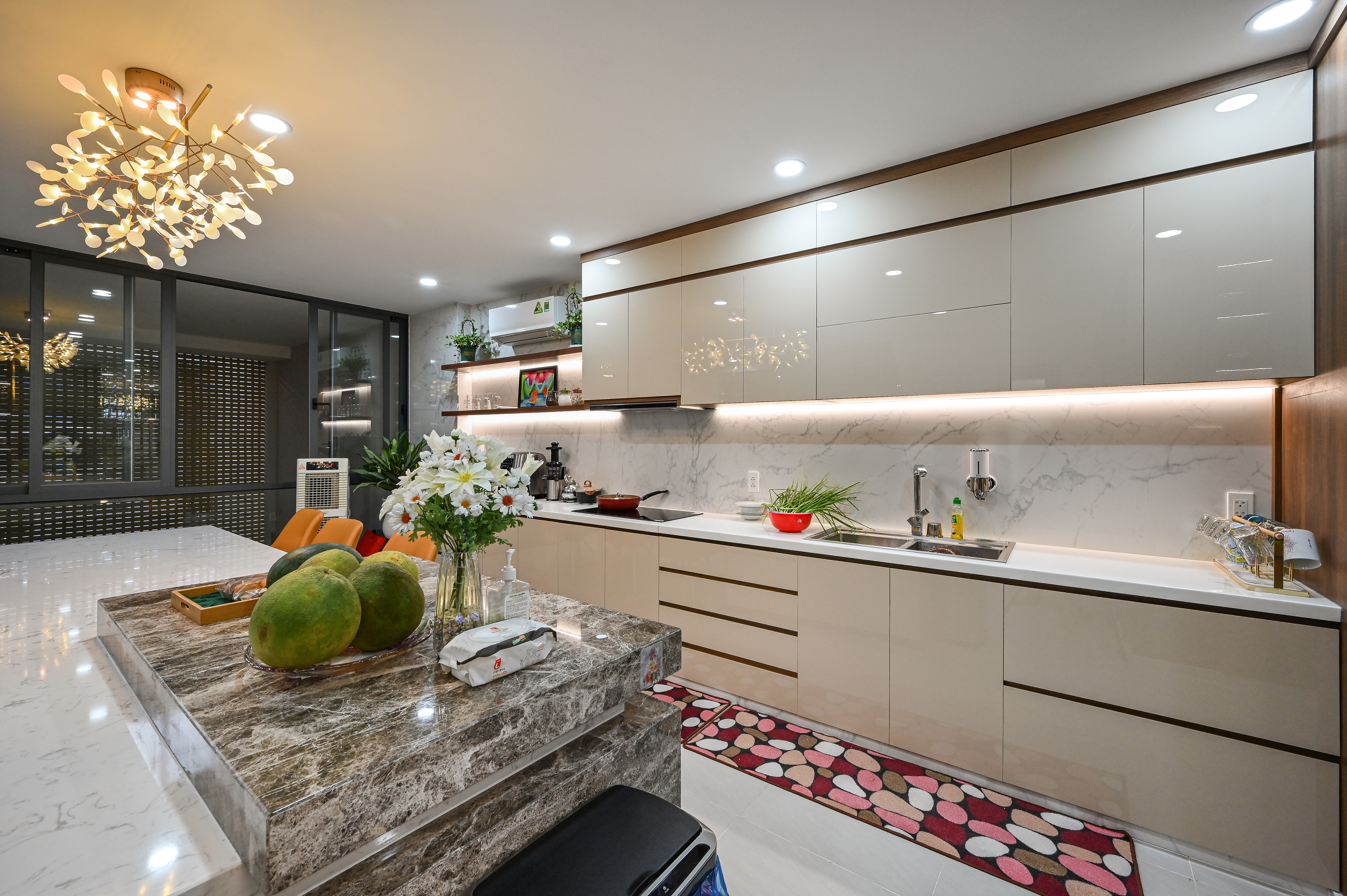 Hệ tủ bếp trên – dưới được thi công từ vật liệu gỗ An Cường phủ Acrylic bóng gương, giúp phản chiếu ánh sáng tự nhiên, tăng chiều sâu và cảm giác rộng rãi. Bề mặt tường bếp được ốp đá vân mây đồng bộ, vừa sang trọng vừa dễ vệ sinh – một chi tiết thể hiện sự tỉ mỉ và thực tế trong quá trình thi công.