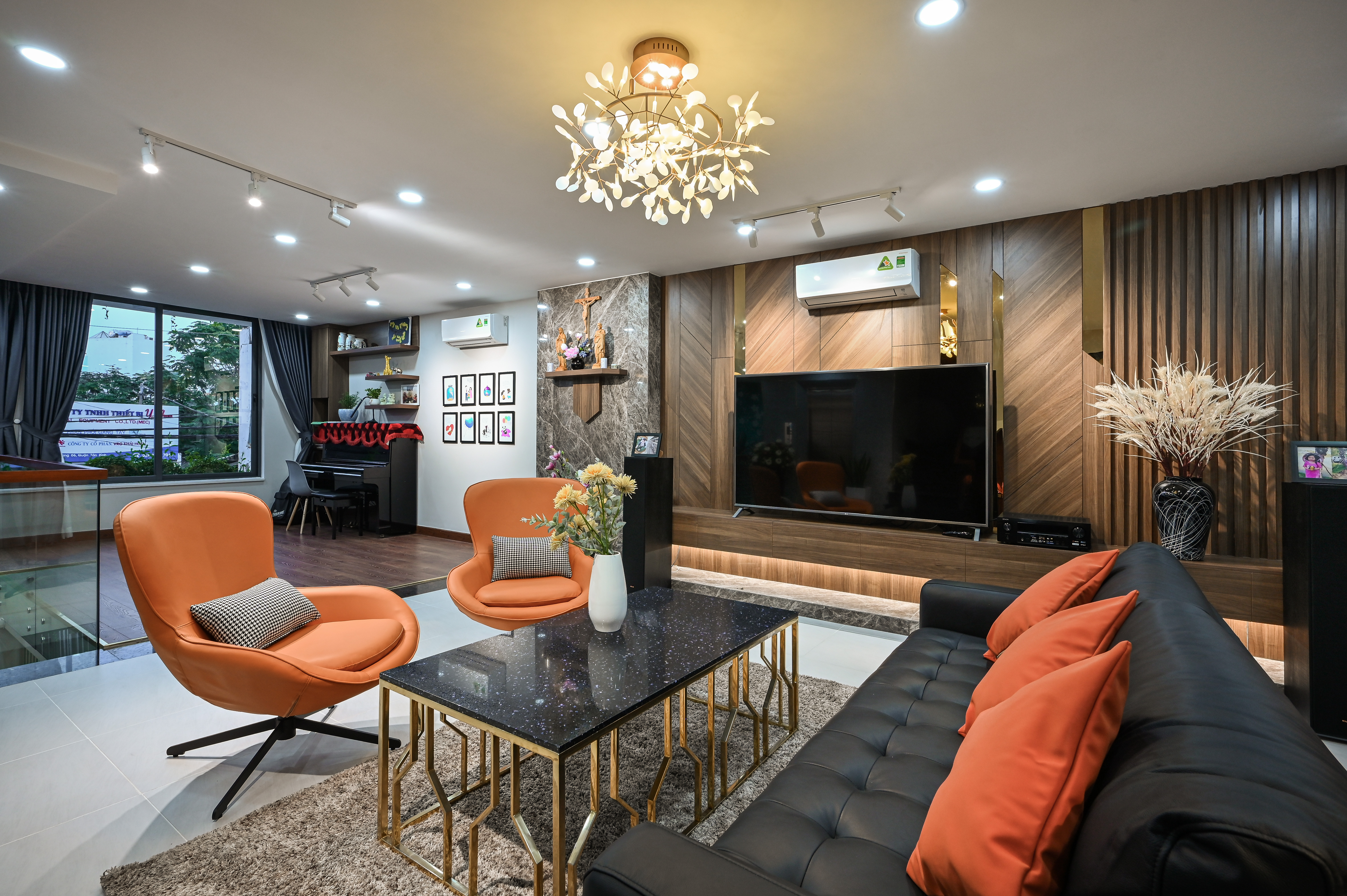 Bộ đôi ghế bành xoay màu cam tạo điểm nhấn năng động, đối diện ghế sofa da đen điểm xuyết gối cam nổi bật, kết hợp cùng bàn trà chân kim loại ánh vàng và mặt đá đen ánh kim — một chi tiết vừa sang trọng vừa có tính “trang trí kết cấu”, kéo nhãn quan người nhìn vào trọng tâm không gian. Thảm trải sàn mềm mại giữ nhịp ấm và giảm âm, đồng thời phân vùng rõ ràng khu tiếp khách trên nền gạch sáng.
