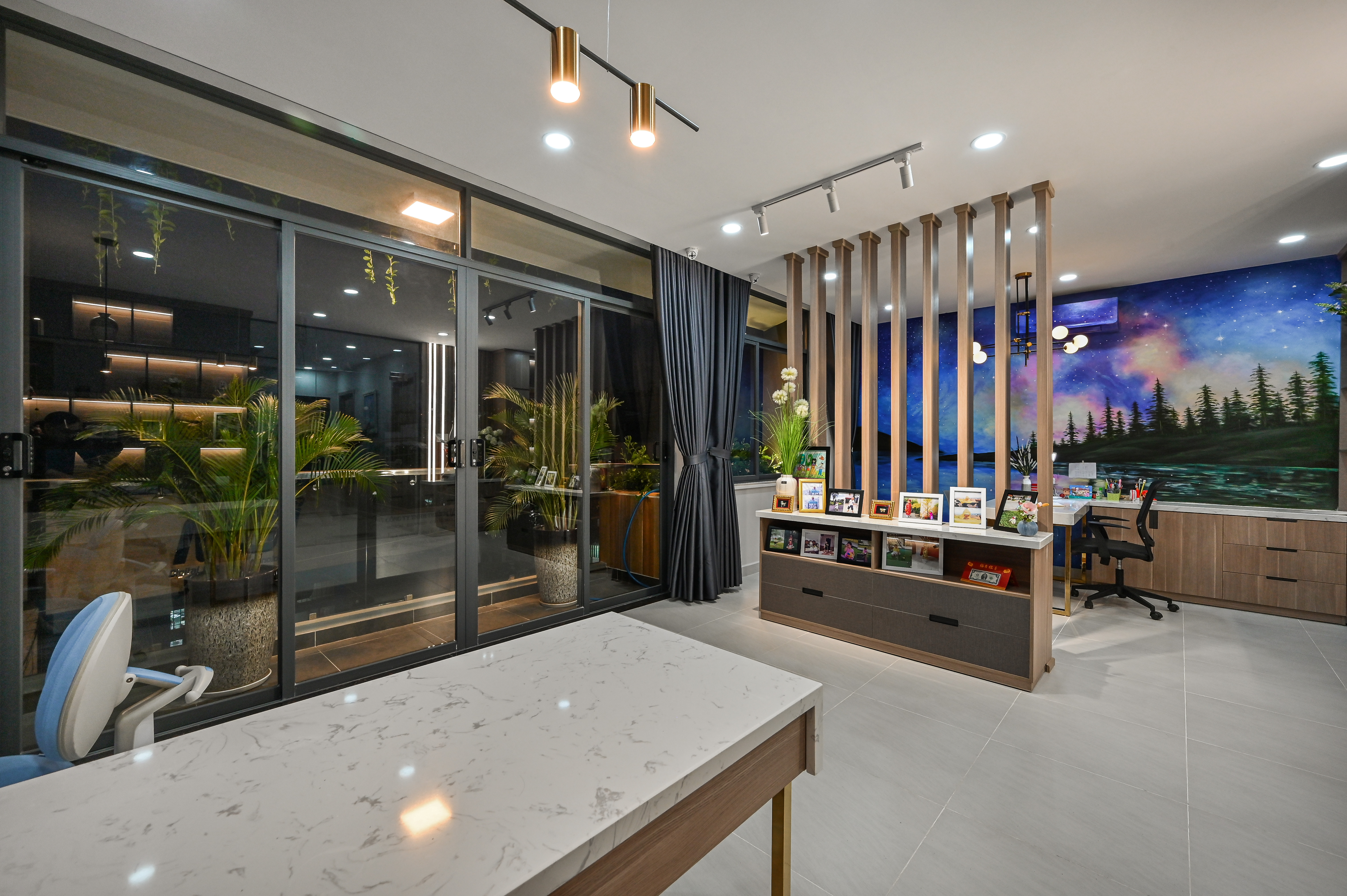 Từng nét vẽ uyển chuyển kết hợp hài hòa cùng ánh sáng tự nhiên tràn qua lớp kính cường lực, tạo nên cảm giác mở rộng, thanh thoát mà vẫn sang trọng.