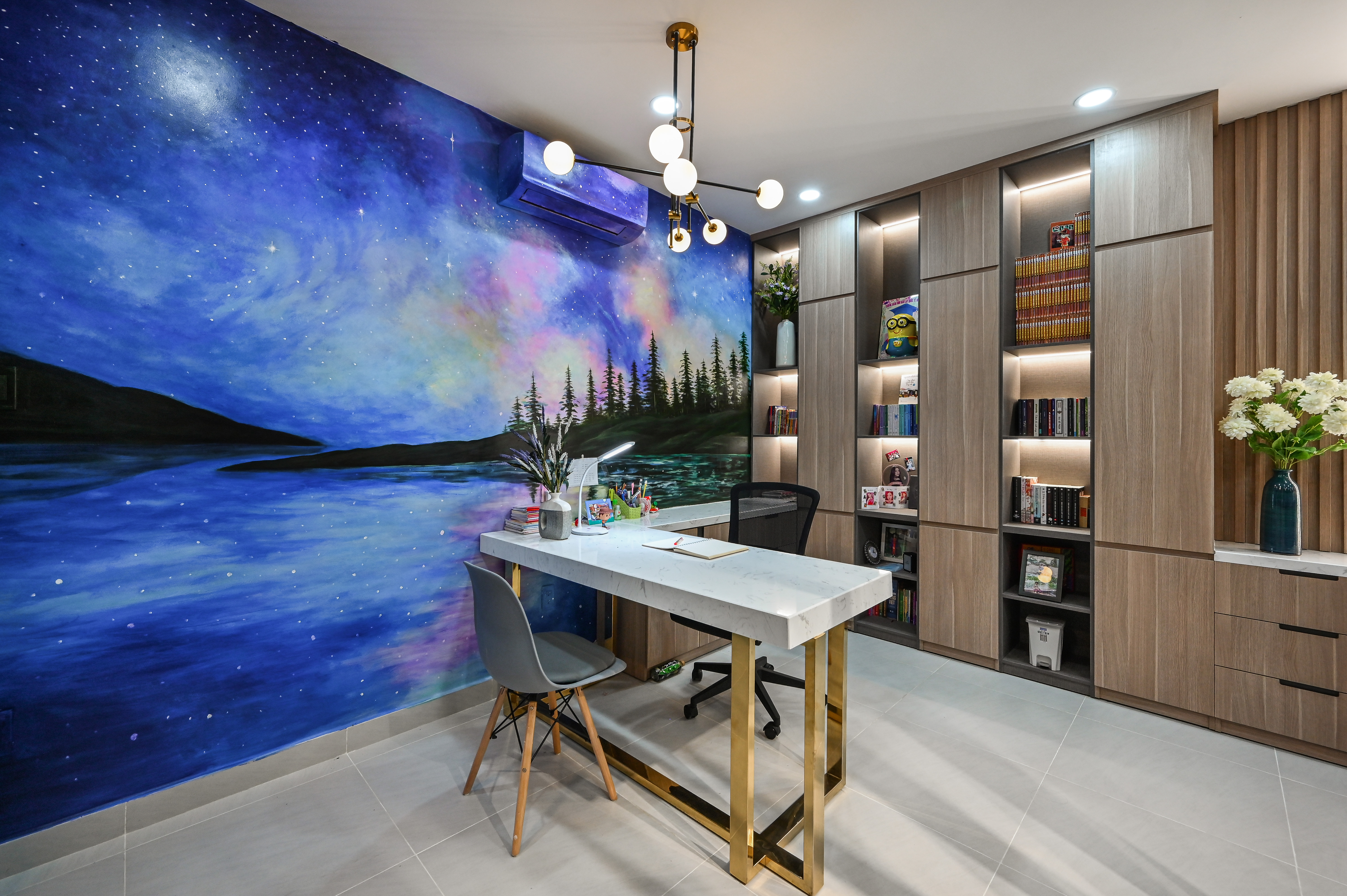 Tường đầu giường: Sơn vẽ thủ công hình ảnh núi tuyết và bầu trời cực quang, sử dụng sơn acrylic cao cấp chống ẩm, chống bạc màu – tạo điểm nhấn nghệ thuật mạnh mẽ. Hệ chiếu sáng kết hợp đèn âm trần, đèn rọi ray và đèn LED hắt tủ, mang lại lớp sáng đa tầng – hỗ trợ học tập và vui chơi.