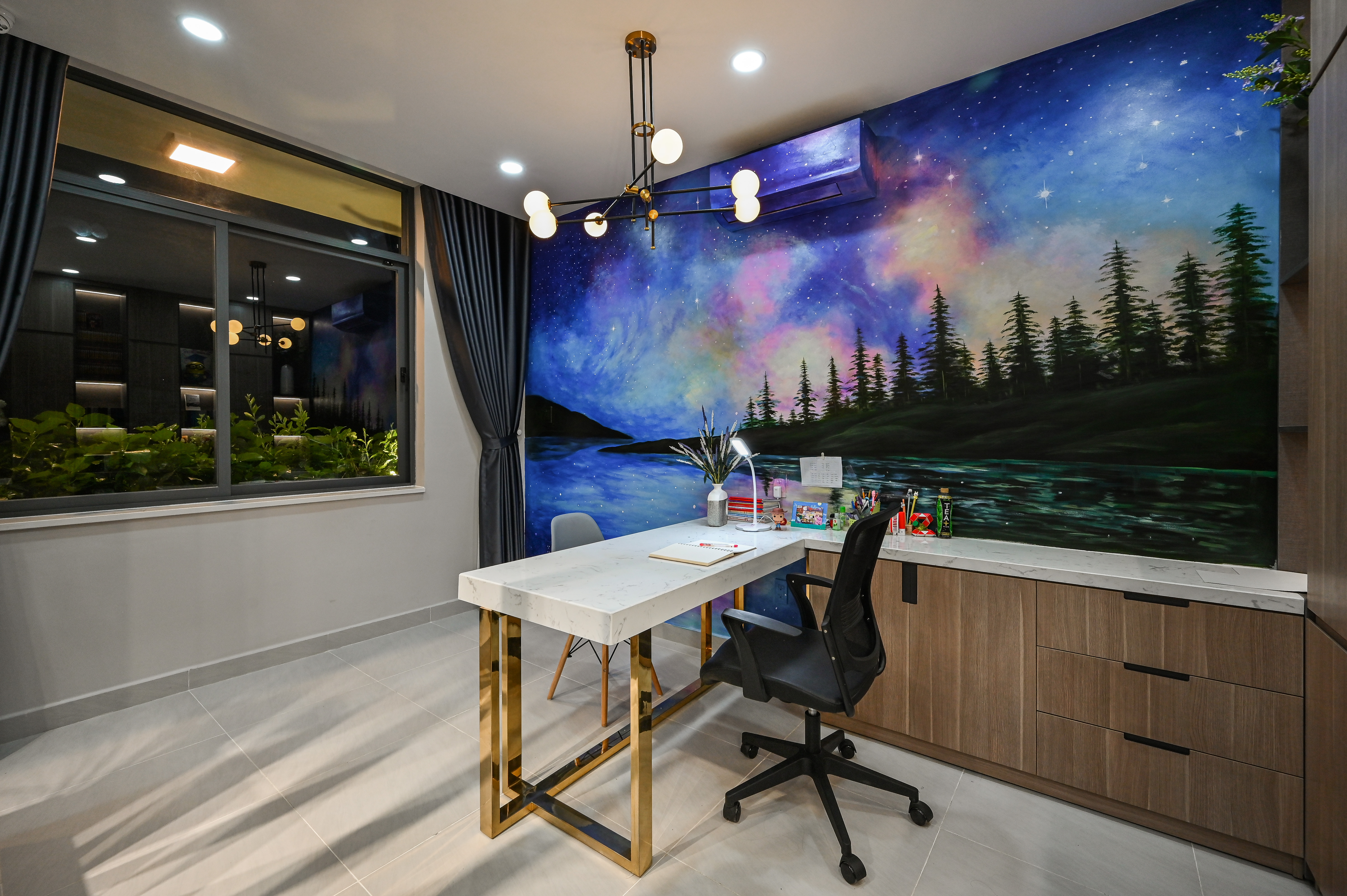 Tường học và làm việc là tâm điểm sáng tạo của không gian, được vẽ tay bằng sơn nghệ thuật với chủ đề thiên hà và rừng đêm. Gam màu chuyển động từ tím – xanh – hồng tạo nên chiều sâu không gian, gợi cảm giác mở rộng và kích thích trí tưởng tượng.