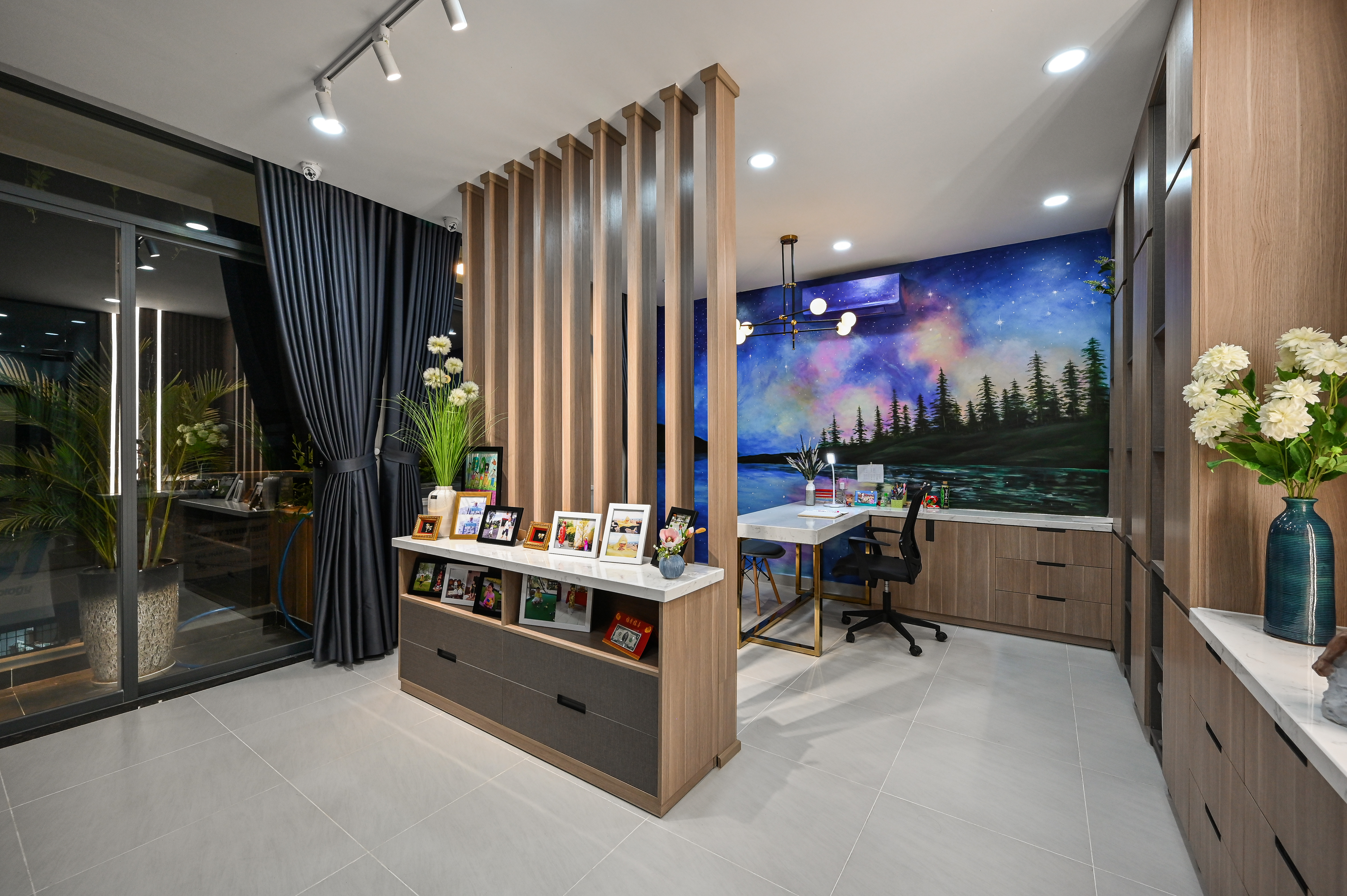 Kệ trang trí âm tường phối cánh màu ghi xám xen kẽ các hộc trưng bày gắn led ánh sáng vàng giúp nổi bật từng món decor và đồ lưu niệm, thể hiện gu thẩm mỹ riêng của gia chủ. Các bức tường được nhấn bằng mảng vẽ tay nghệ thuật, kết hợp cây xanh và ánh sáng tự nhiên – tạo cảm giác gần gũi, nhẹ nhàng nhưng vẫn đậm chất hiện đại.