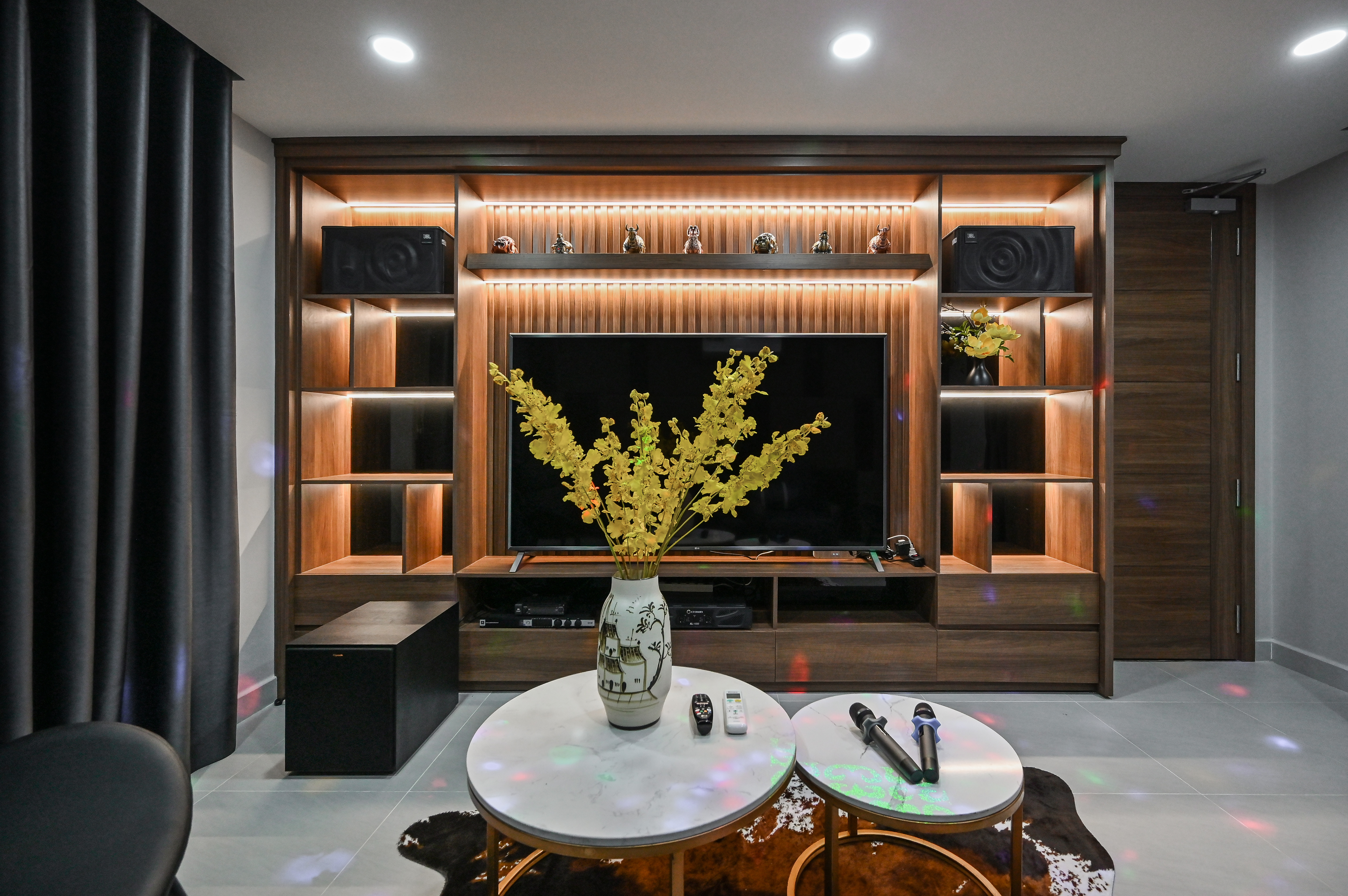 Trần thạch cao phẳng kết hợp đèn LED âm trần ánh sáng trung tính, đồng thời bố trí đèn chiếu điểm sân khấu để hỗ trợ không khí giải trí. Hệ thống loa được bố trí âm học khoa học, đồng bộ với vật liệu tiêu âm tường, đảm bảo chất lượng âm thanh cân bằng và chân thực.