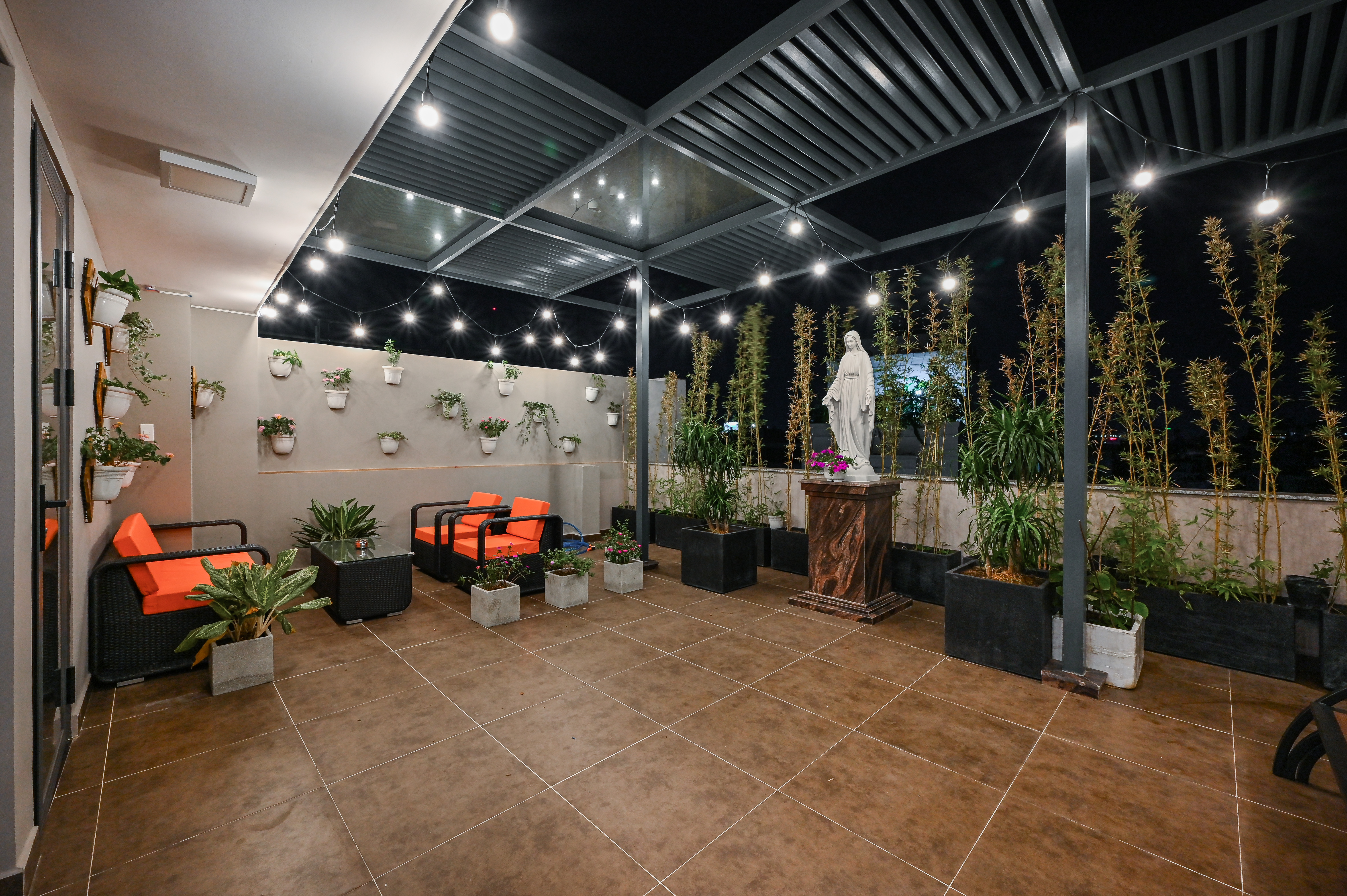 Tường được xử lý bằng sơn ngoại thất chống thấm Kova cao cấp, tông màu xám trung tính giúp làm nổi bật các chậu cây treo trang trí. Các chậu cây treo được cố định trên giá gỗ teak xử lý PU ngoài trời, chống mục và cong vênh. Dọc tường còn bố trí hàng cây trúc cảnh và phát tài núi trong chậu composite đen mờ, tạo cảm giác riêng tư và giảm nắng trực tiếp.